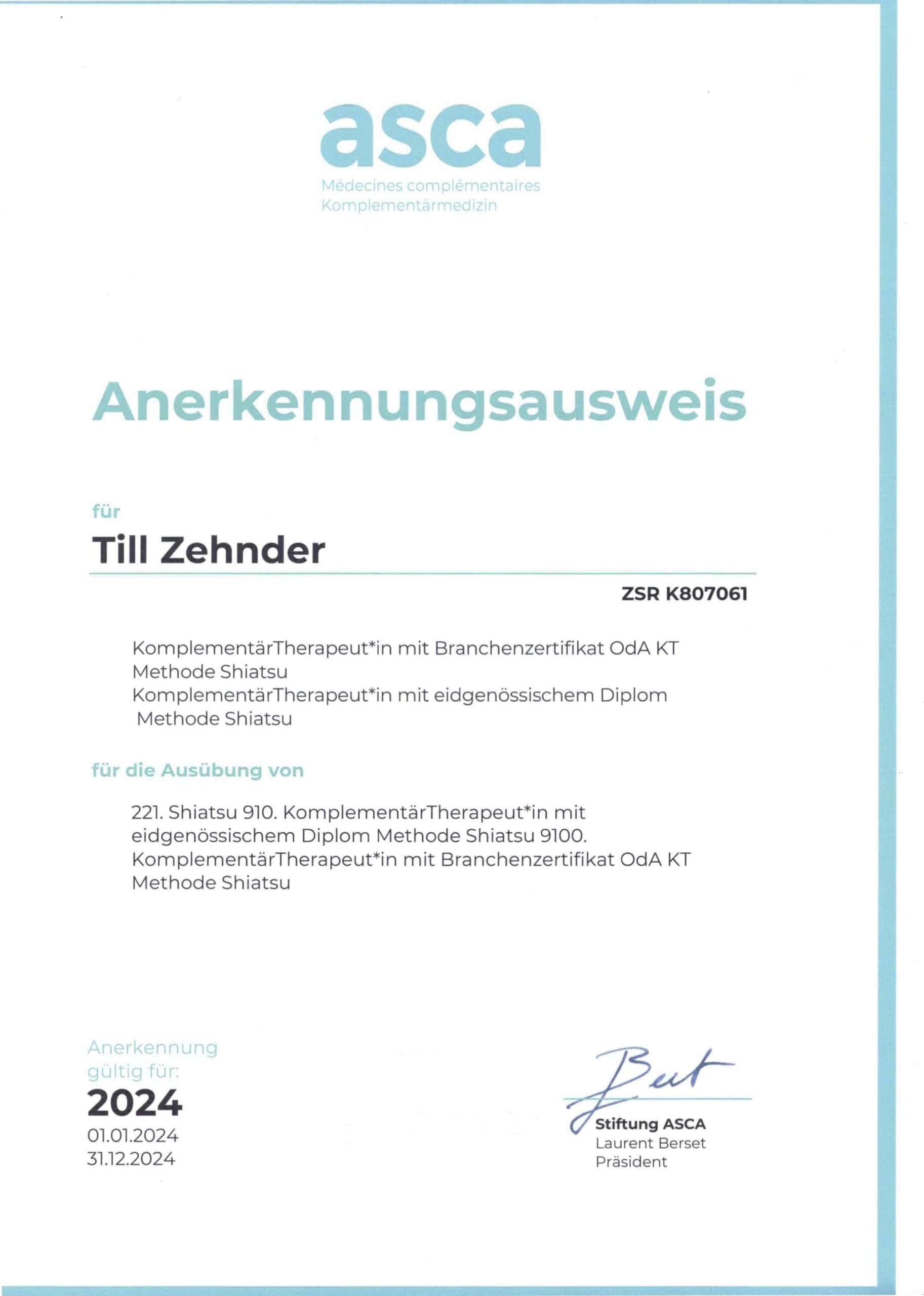 Anerkennung durch Krankenkassen: Shiatsupraxis Till Zehnder weiterhin registriert