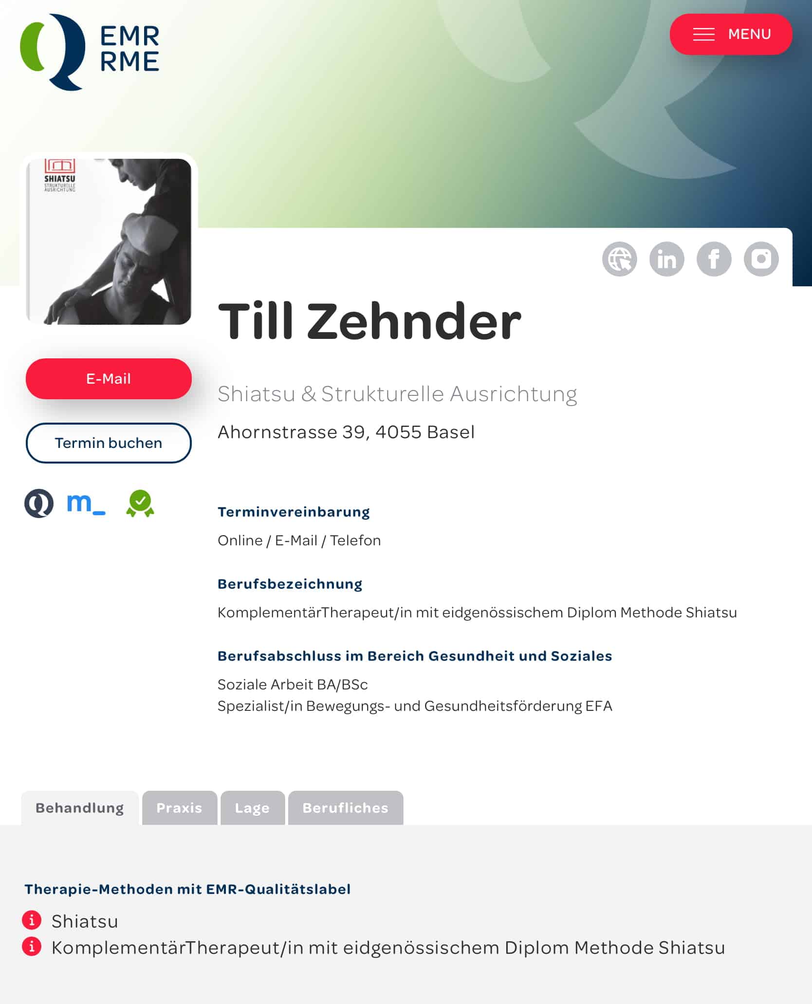 Mein Bein wirkt plötzlich einen halben Meter länger als das andere. Ein seltsames Gefühl, das mich zum Schmunzeln bringt. «Stress führt zu Kontraktionen der Muskulatur bis in die Fussspitzen», erklärt mir anschliessend der Mensch, der dafür verantwortlich ist: Shiatsu-Therapeut Till Zehnder. «Durch spezielle Shiatsu-Techniken dehne ich Faszien (Bindegewebe) und Muskulatur, das fühlt sich dann manchmal an, als wären Arme oder Beine deutlich länger. » Der Name Shiatsu kommt aus dem Japanischen und bedeutet Fingerdruck. Das Wort ist Programm, der Druck wird senkrecht und stabil durch den Einsatz des Körpergewichts mit Händen, Daumen, Fingern, Ellbogen, Knien und Füssen ausgeübt. Meridiane und Punkte werden stimuliert, wobei je nach energetischer Verfassung des Behandelten die Drucktechnik, die Stärke und Intensität der Stimulation variieren. Bei Till Zehnder liegt man dabei auf einem grossen Futon. Behandelt wird angezogen, weshalb die Kleidung gemütlich sein sollte, ohne Knöpfe oder störende Reissverschlüsse. «Das ist wichtig, weil beim Shiatsu Strukturen (welche teilweise sehr, sehr tief liegen) mittels Massage und Dehnung gelöst werden. Das ist mit Jeans nicht angenehm und auch nicht immer möglich.» Für seine Klienten hat Till daher immer weite Hosen und warme Pullis parat. Der gebürtige Basler beschäftigt sich seit etwa 20 Jahren mit Shiatsu. Gerade hat er die Höhere Fachprüfung zum diplomierten Komplementärtherapeuten bestanden. Seine Shiatsu-Ausbildung hat er bereits 2010 an der International School of Shiatsu in Bern (Kiental) gemacht.